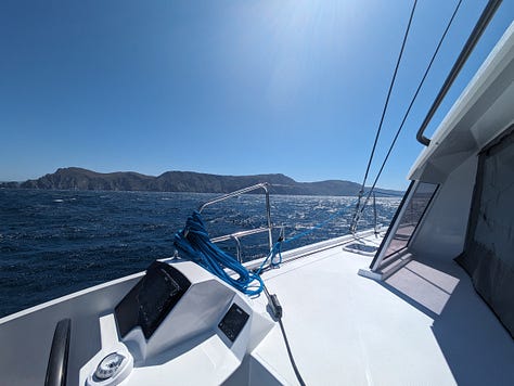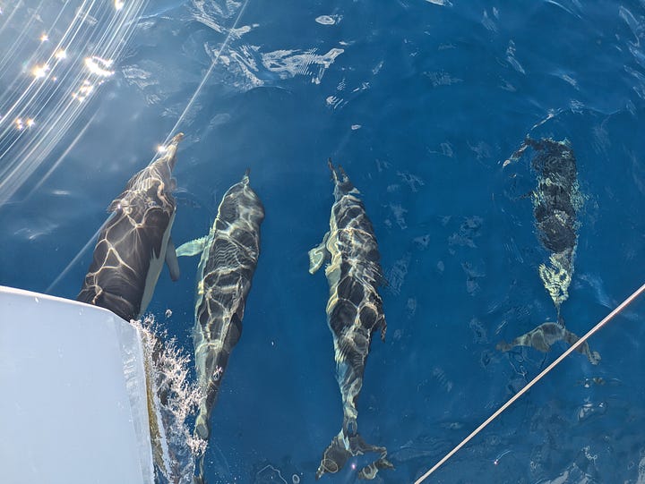 During the day the wind dropped and we started the engines, also recharging the batteries. And warming up water for a mid-sea shower! Lovely! A large group of more than 8 dolphins joined us. Great to watch them looking at us while laying on the trampoline (netted area, between the two hulls on the front of the boat).