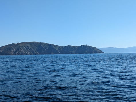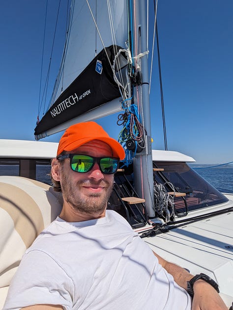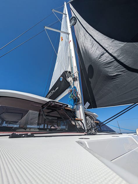 Just before Baiona I lowered the mainsail and Eus videocalls me on Whatsapp. Starlink is really great! Great fun to see and speak to my family while underway. While we're chatting another group of dolphins pops up at the bow, and I could show them live!