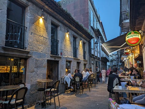 This time we had dinner on-board and were finished just in time to dock in Baiona. Baiona is a bit larger village than Muxia, with a large castle overlooking the bay of Vigo. We saw a great sunset before we enjoyed a cocktail in a busy alley.